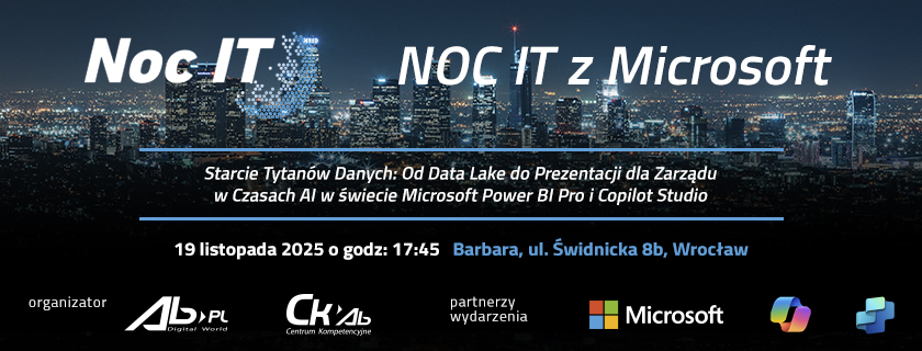 „Starcie Tytanów Danych: od Data Lake do Prezentacji dla Zarządu w Czasach AI w świecie Microsoft Power Bi Pro i Copilot Studio” – pod takim tytułem odbędzie się najbliższe spotkanie z serii Nocy IT. Wydarzenie we “wrocławskiej Barbarze” już w środę 19 listopada. Wstęp jest bezpłatny.